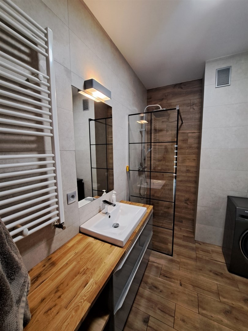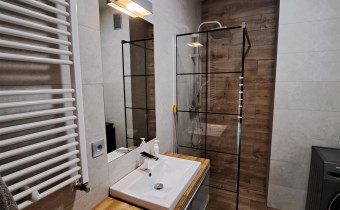 Wyposażenie łazienki kabina prysznicowa, lustro, pralka, umywalka, WC