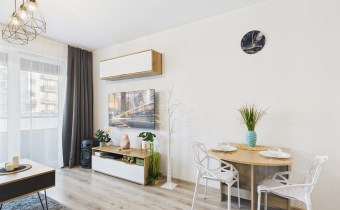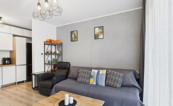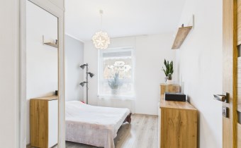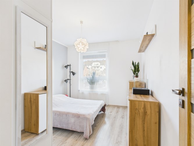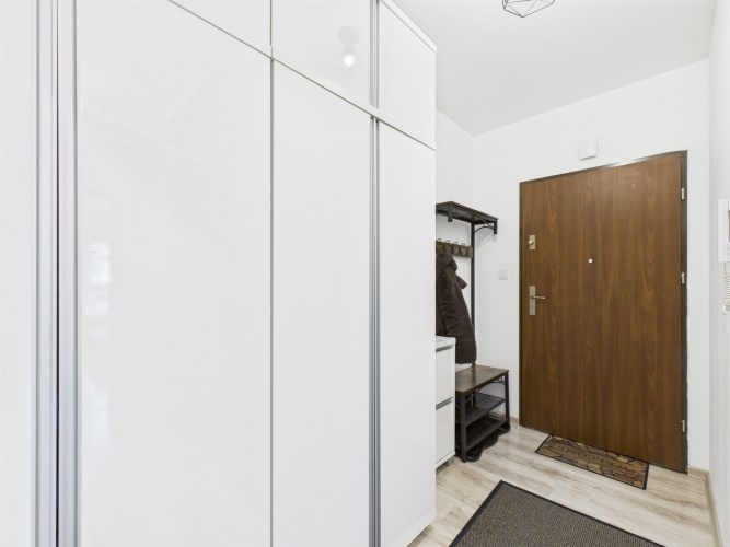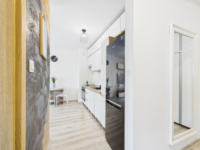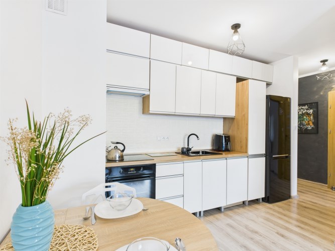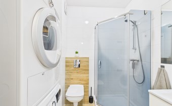 Całość urządzona w spójnym, nowoczesnym stylu i gotowa do zamieszkania bez dodatkowych nakładów finansowych. Łazienka została w pełni wyposażona i posiada prysznic, pralkę oraz suszarkę, co znacząco podnosi komfort użytkowania.