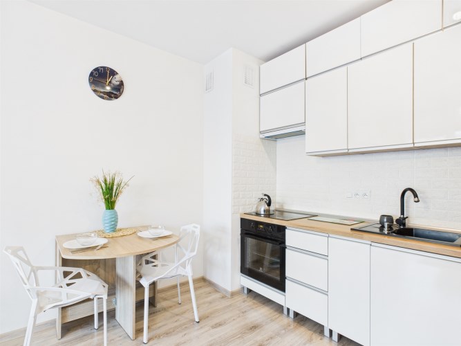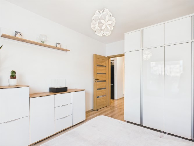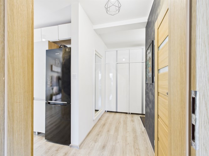Z przestronnego salonu prowadzi wyjście na balkon o szerokości całego salonu, stanowiący idealne miejsce do wypoczynku. Kuchnia została wykonana w nowoczesnej zabudowie i wyposażona w nowoczesny sprzęt AGD, zapewniający komfort codziennego użytkowania. Mieszkanie oferuje liczne, pojemne szafy, które gwarantują dużą ilość miejsca do przechowywania.