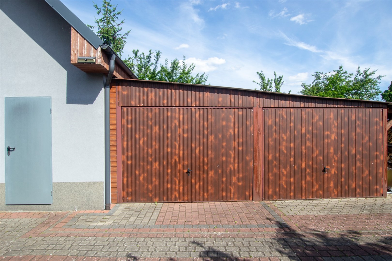 Na działce mamy dwustanowiskowy garaż a za nim teren wypoczynkowy z krzewami i drzewami.