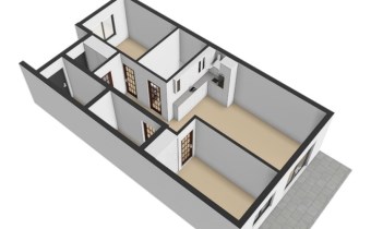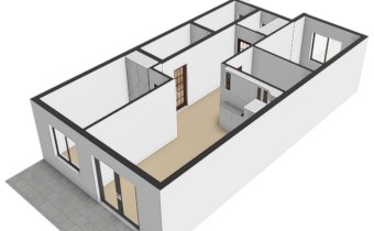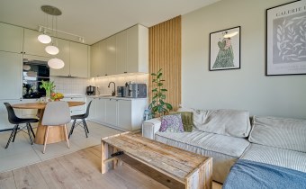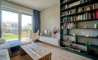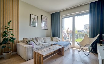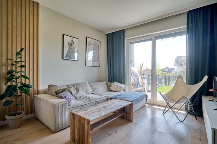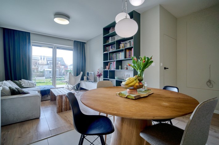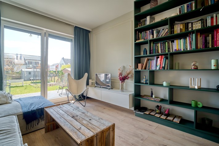 - Salon z aneksem kuchennym z bezpośrednim wyjściem na taras i dalej do ogródka
