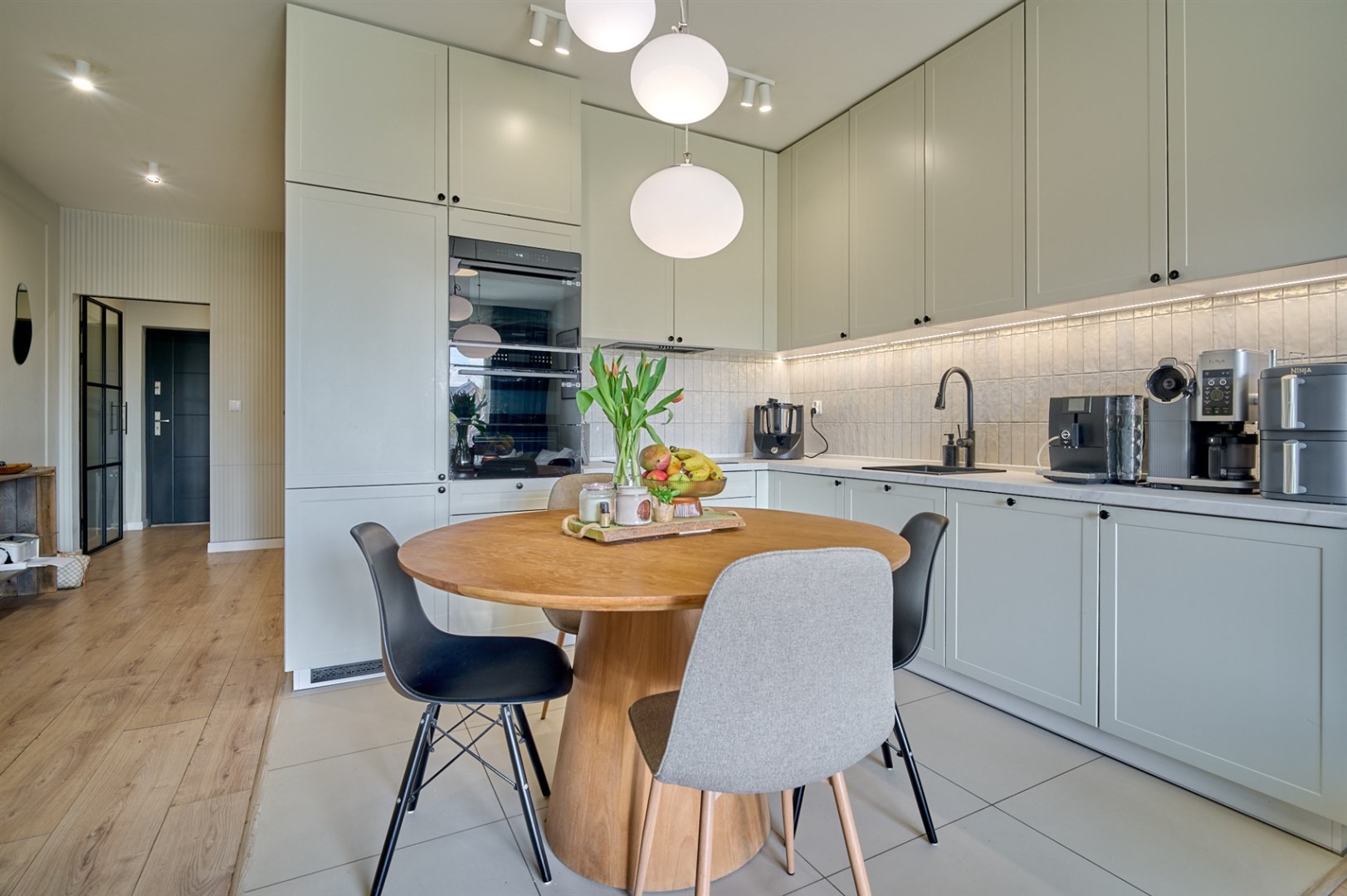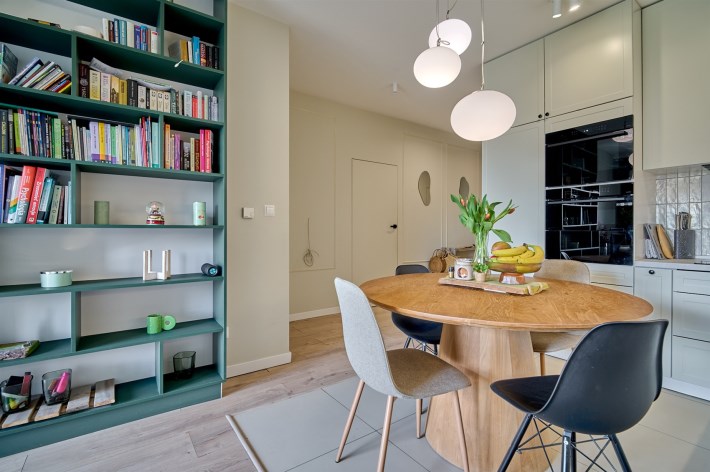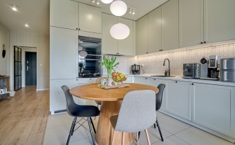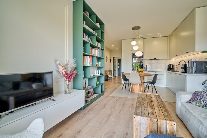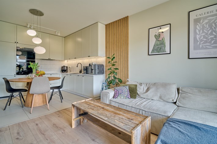 Duży salon połączony z kuchnią oraz pozostawione meble i zabudowy - nie musisz zaczynać od zera.