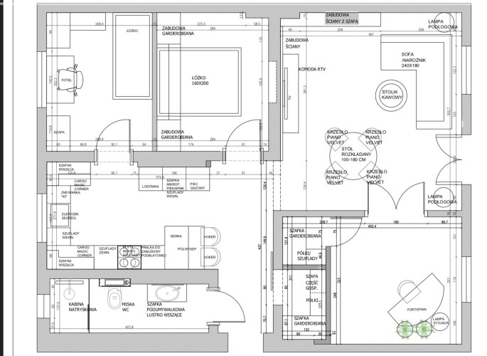Nieruchomość sprzedawana jest z z pełnym umeblowaniem widocznym na zdjęciach w tym: zabudową kuchenną wraz ze sprzętem AGD (lodówka, piekarnik, płyta indukcyjna, zmywarka, okap, mikrofala),