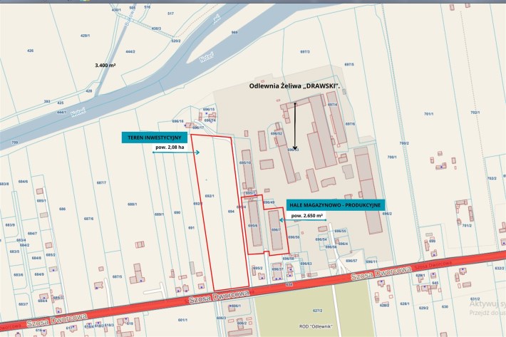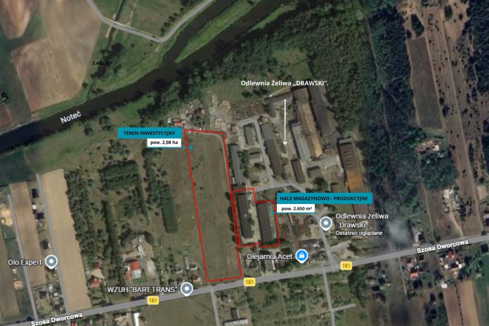 Na sprzedaż funkcjonalny kompleks nieruchomości produkcyjno-magazynowych z zapleczem socjalnym oraz dużym terenem inwestycyjnym o przeznaczeniu usługowym, położony w Drawskim Młynie przy ul. Szosa Dworcowa (powiat czarnkowsko-trzcianecki, woj. Wielkopolskie), w bezpośrednim sąsiedztwie Odlewni Żeliwa „DRAWSKI”.